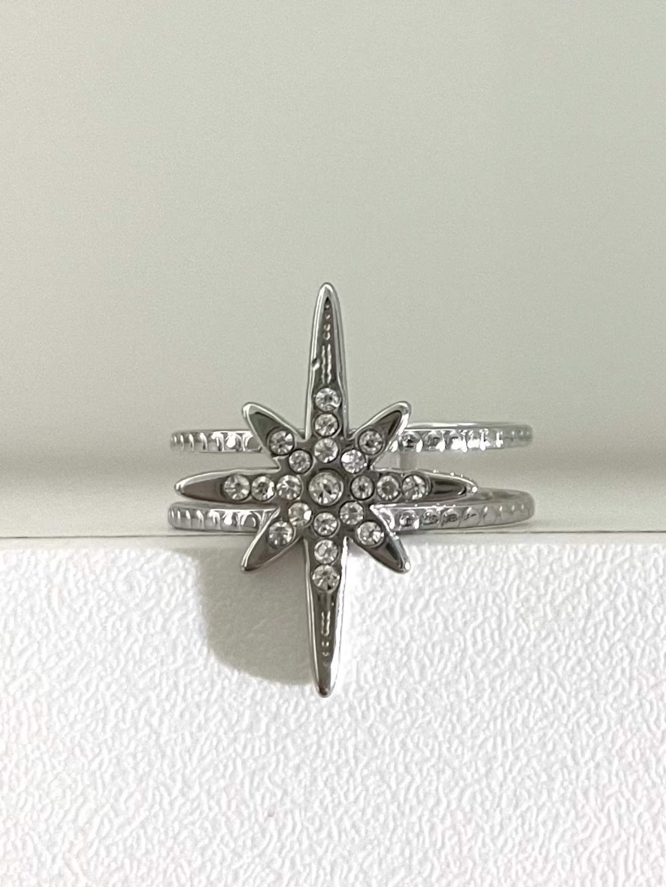 - Détails : Double anneau, ornée d’une étoile polaire sertie de strass